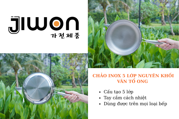 - Công nghệ nguyên khối 5 lớp – Khác với các dòng chảo inox thông thường, Jiwon sử dụng công nghệ ép nguyên khối 5 lớp (3 lớp inox 304 + 2 lớp nhôm dẫn nhiệt) cho khả năng chịu nhiệt vượt trội.